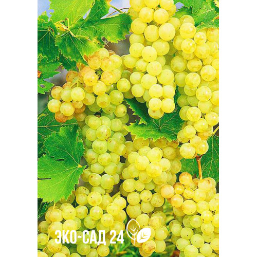 Грозди средней величины достигают в длину в среднем около 10 см, а в ширину примерно 8 см. Круглые плоды достигают в диаметре примерно 15 мм и окрашены они в желтый цвет с золотистым оттенком (см. фото). Не толстая кожица покрывает сочную мякоть, которая имеет приятный мускатный аромат. В каждой ягодке находится по 2-3 косточки.